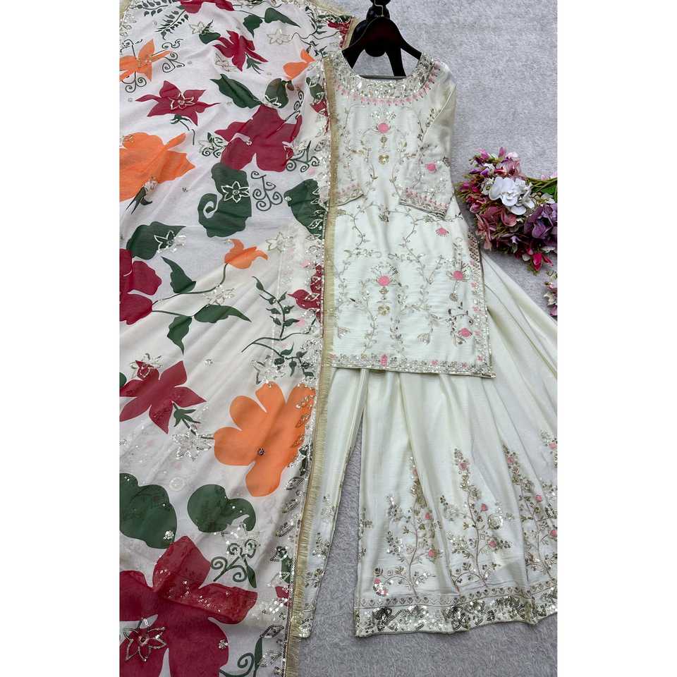 WW Designer Women's White Cinon Silk Top Sarara & Dupatta Set Heavy Party Wear Look Suit Size XL