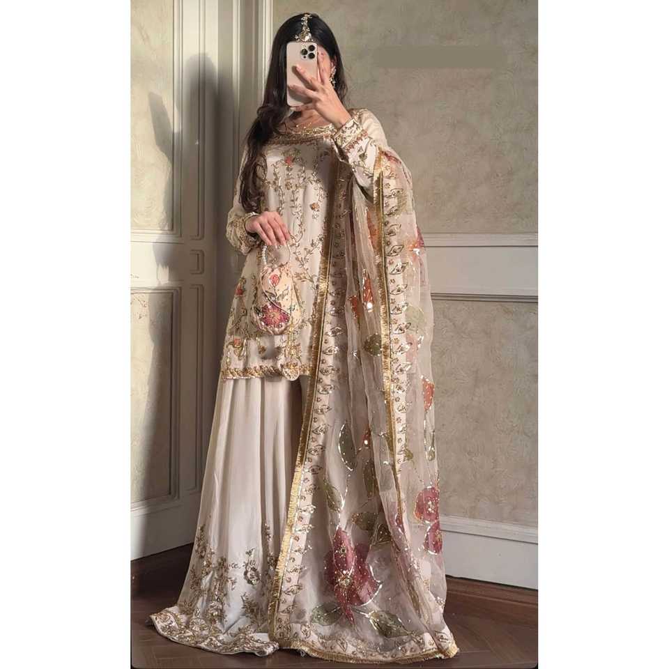 Designer Women's Cinon Silk Top Sarara & Dupatta Set Heavy Party Wear Look Suit