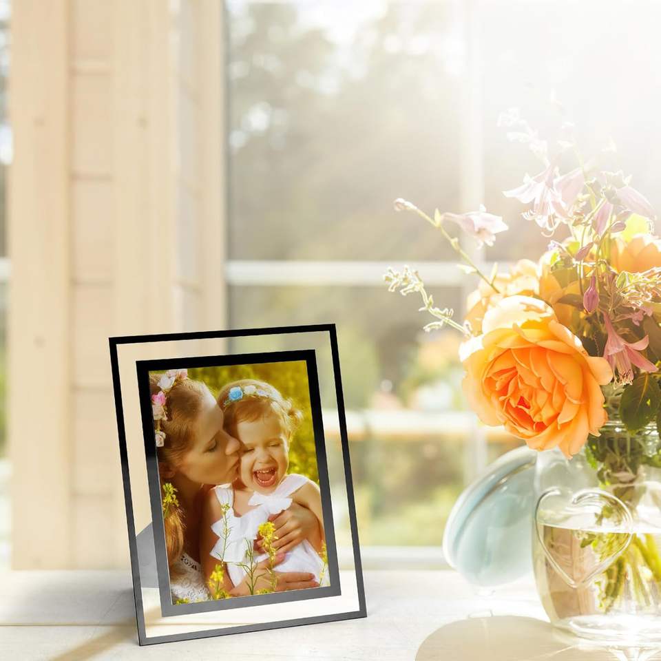 Cadre photo en verre design avec support réglable pour affichage portrait ou paysage, compatible avec diverses tailles de photos