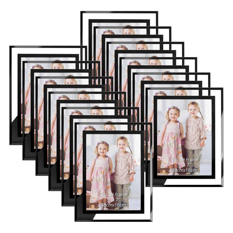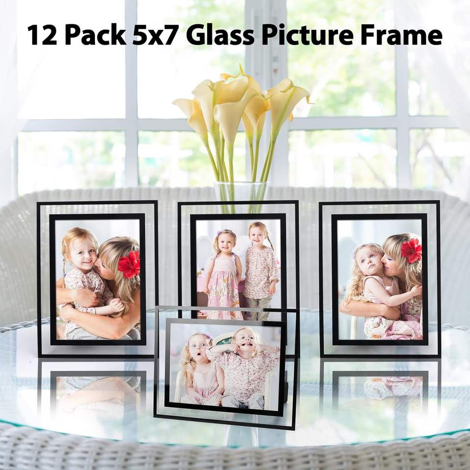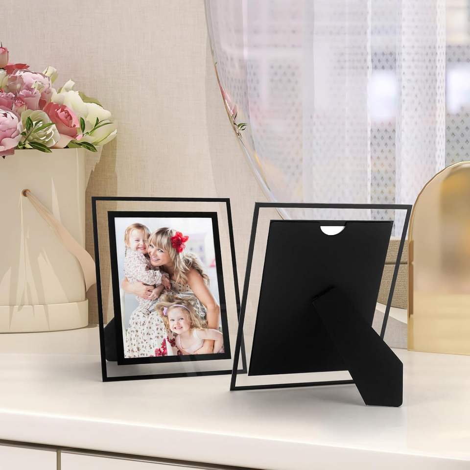 Cadre photo en verre design avec support réglable pour affichage portrait ou paysage, compatible avec diverses tailles de photos