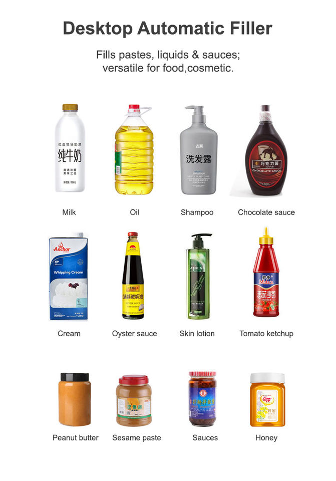 Savon liquide, Gel, Huile, Liquide visqueux, Miel, Pâte, Peindre, Ketchup, Beurre d'arachide, Confiture, Yogourt, Colle, Vernis à onglesMatériau de remplissage