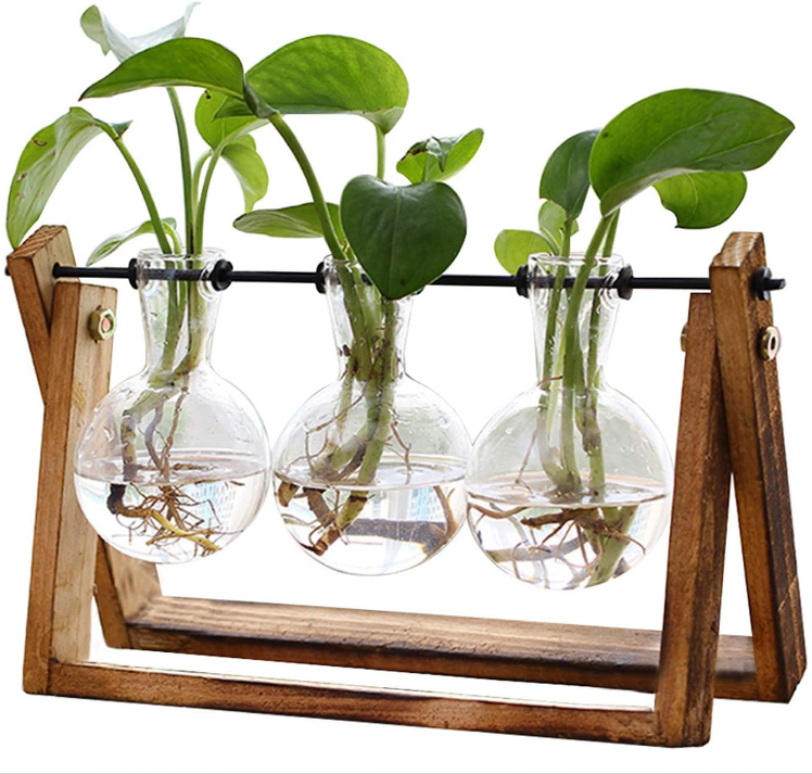 Terrarium en verre pour plantes de bureau - Vase à 3 bulbes avec support en bois massif rétro et support pivotant en métal