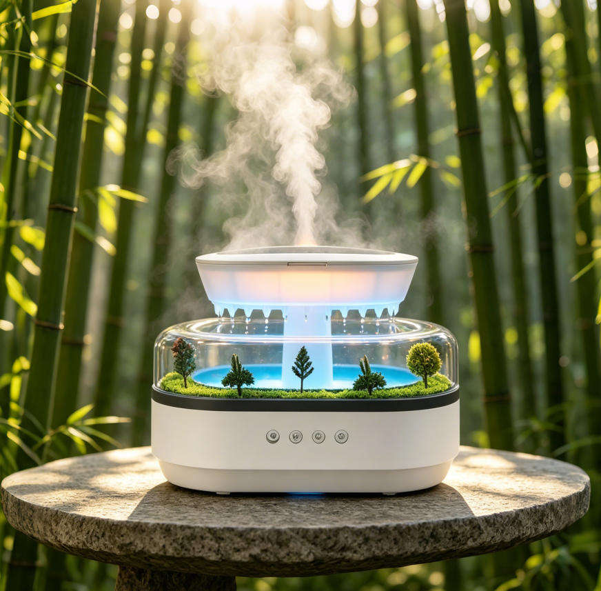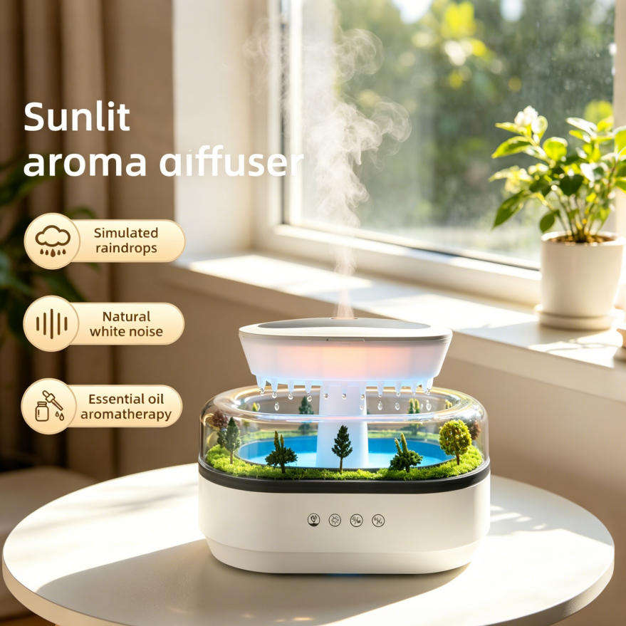 Diffuseur d'arômes ultrasonique de bureau, humidificateur à gouttes de pluie, diffuseur d'huiles essentielles avec bruit blanc naturel et design paysager