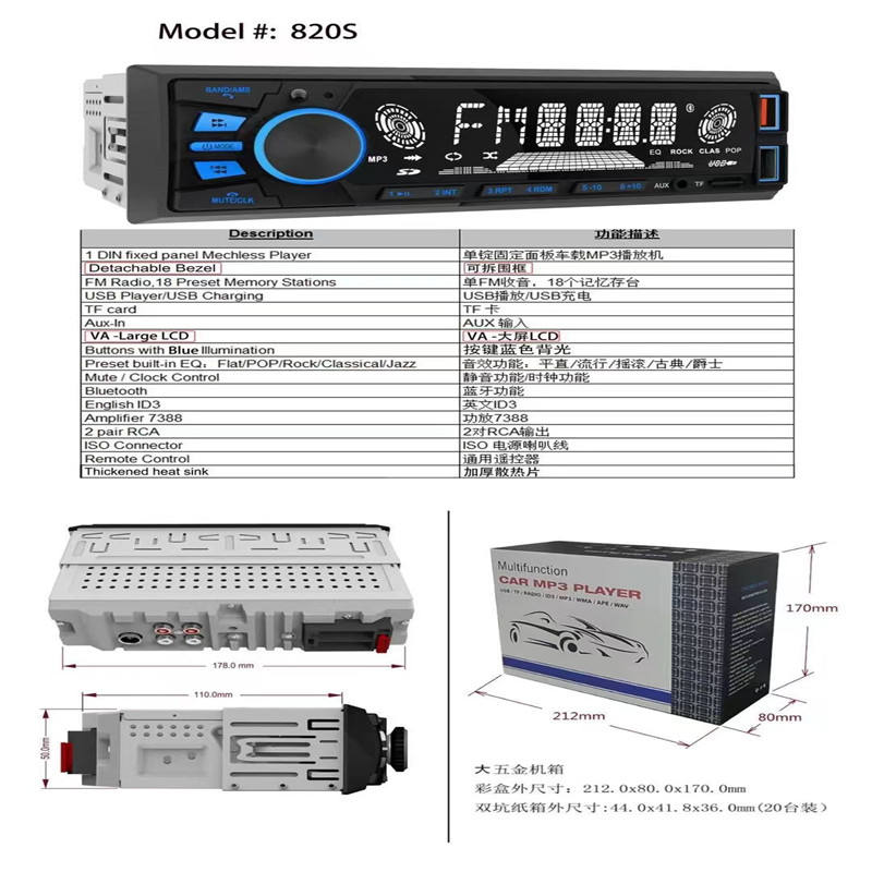 Lecteur DVD de voiture multimédia à panneau détachable, stéréo audio avec BT/DVD/VCD/CD/MP4/MP3/AM/FM