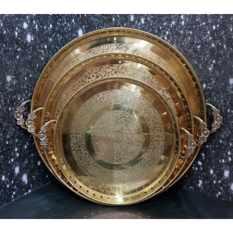 Plateau de service en laiton détaillé, conçu pour les célébrations festives à la maison et la mise en scène artistique de table avec des motifs gravés traditionnels