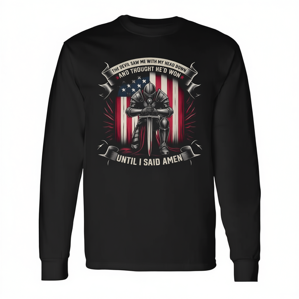 T-shirt à manches longues « Devil Saw Me With My Head Down » avec drapeau américain, déclaration de foi religieuse, col rond unisexe pour adulte
