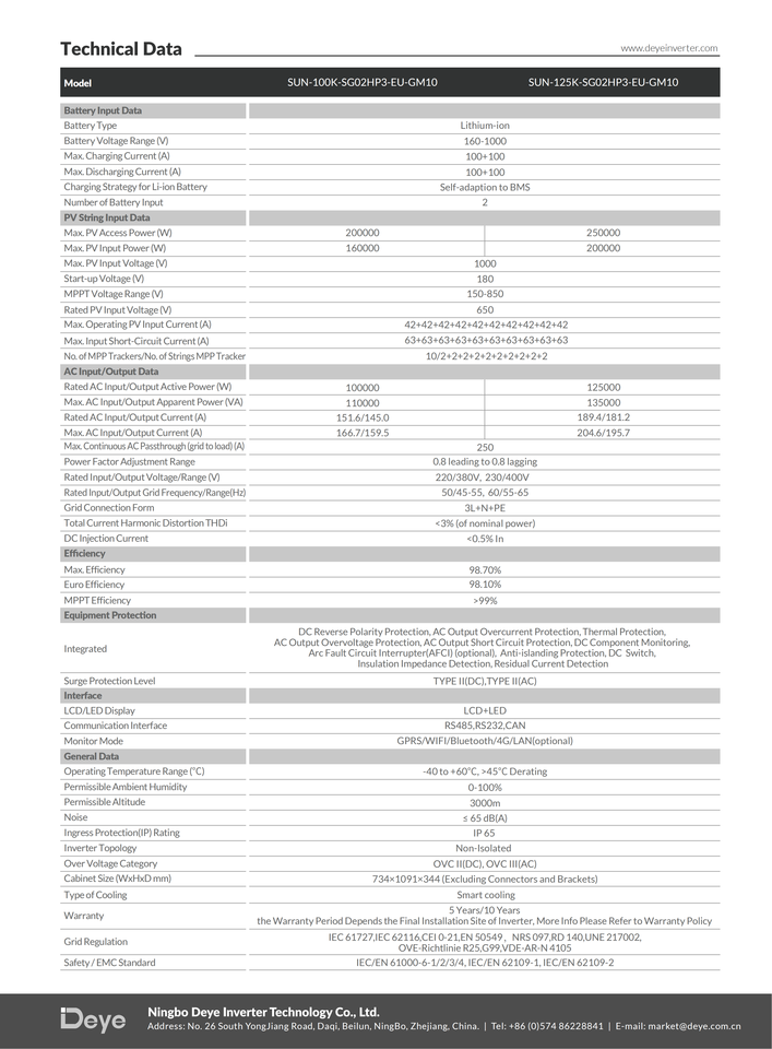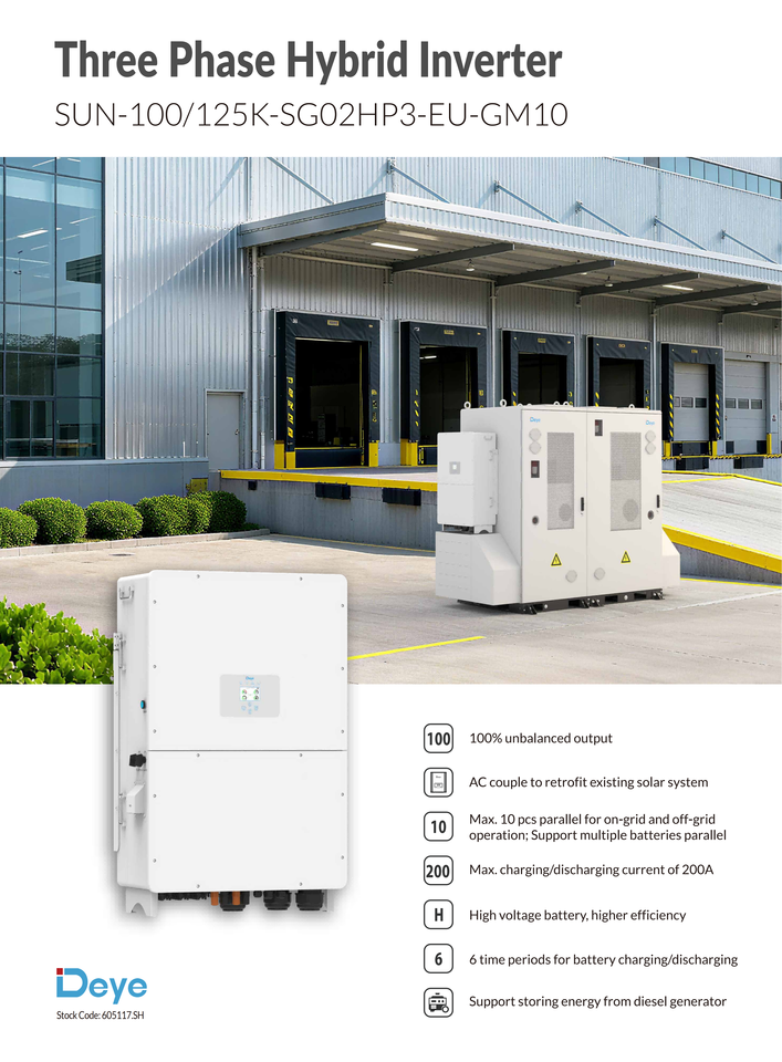 Onduleur triphasé Deye 100 kW Modèle SUN-100/125K-SG02HP3-EU-GM10 CE : Un actif à valeur ajoutée pour optimiser les portefeuilles de propriétés commerciales