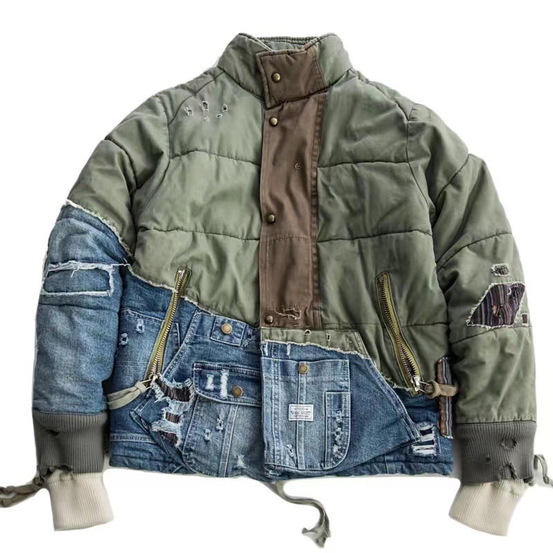 DiZNEW Veste Déchirée à Lavage Lourd Patch Utilitaire Denim Patchwork Puff Jacket Winter Warm Street Duffle Coat Homme