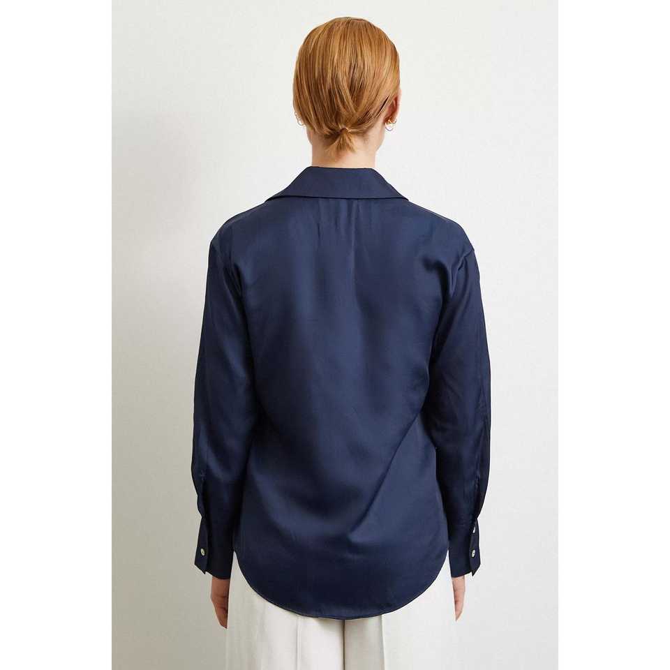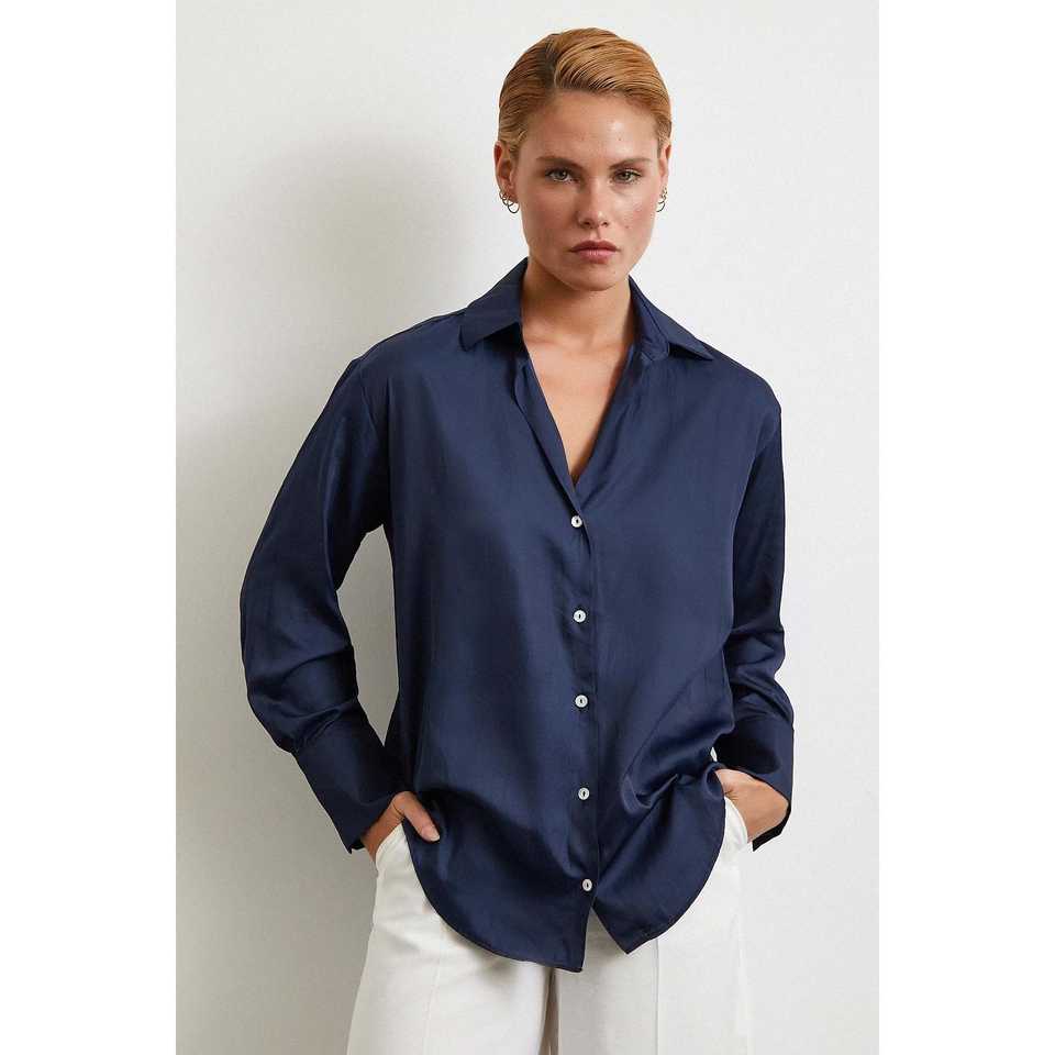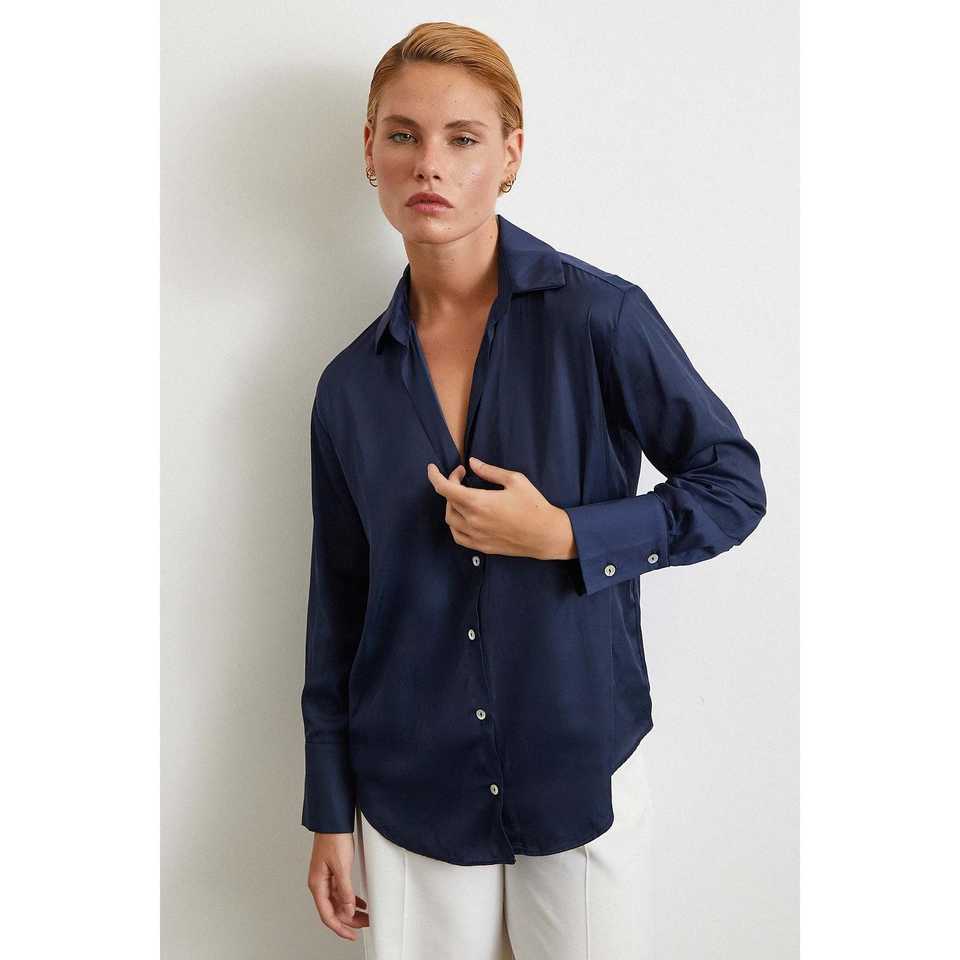 Chemise à motif diagonal pour femme, bleu marine, satin, boutonnée, classique, pour tous les jours