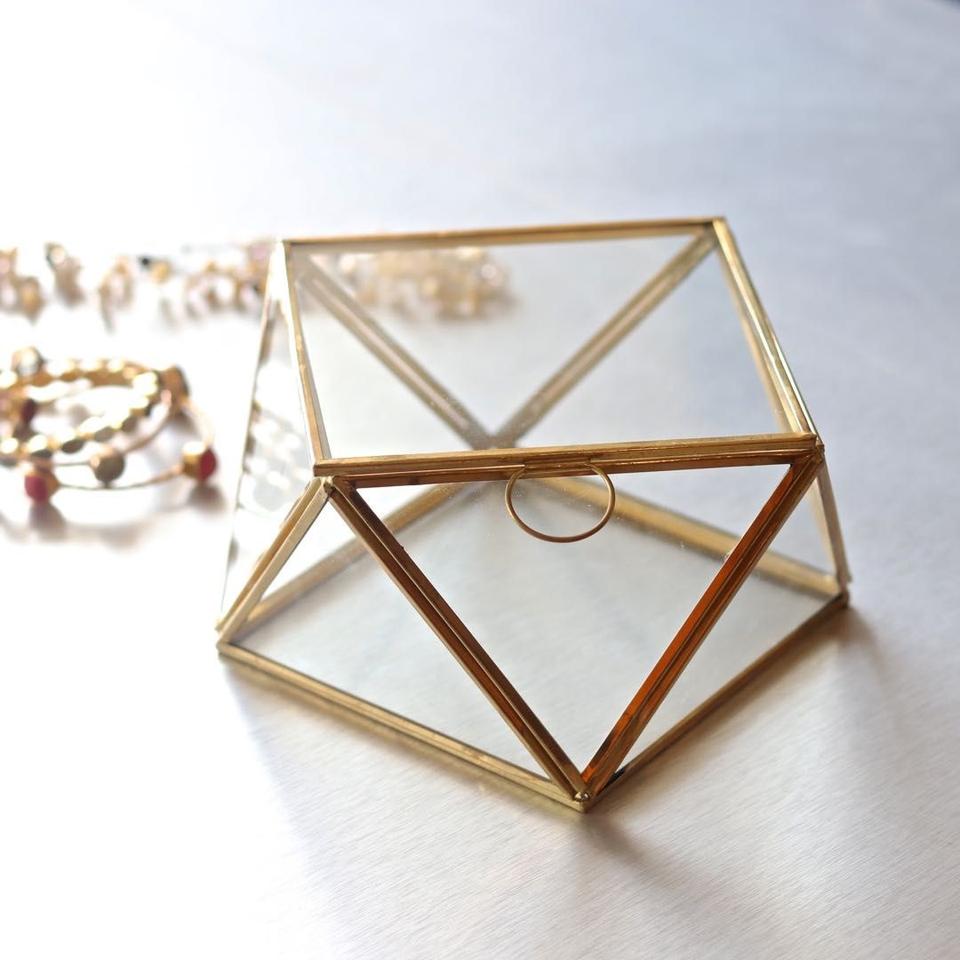 Boîte à bijoux élégante en verre transparent en forme de diamant avec cadre en laiton doré moderne, artisanale et personnalisable, pour ranger bagues et boucles d'oreilles
