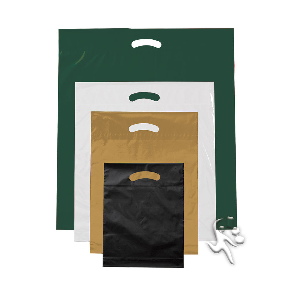 Sac en PEHD blanc imprimé en héliogravure avec poignée découpée et fond carré, personnalisable, 40x47cm, 50 microns, 40% de couverture d'encre, 1c/2s, recyclable