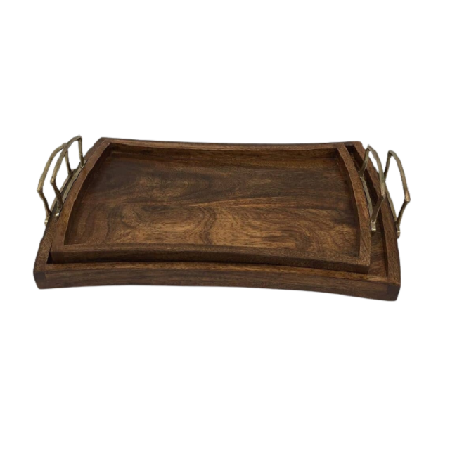 Ensemble de deux plateaux de service en bois de différentes tailles pour hôtel et plateau de nourriture de vaisselle avec poignée en fer à des prix bon marché