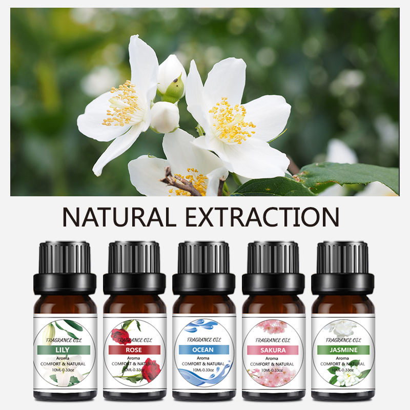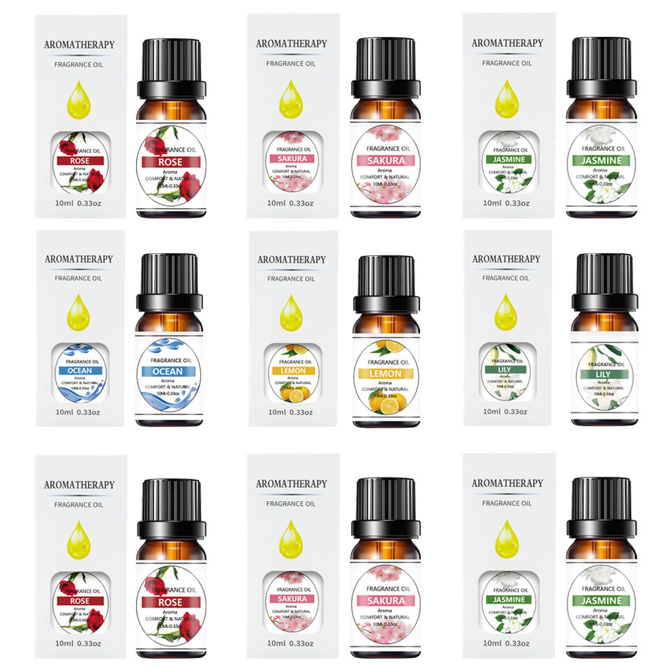Romarin, Rose, Arbre de thé, Eucalyptus, Lavande, Citron, Orange, Jasmin, Palissandre, Santal, Menthe poivrée, Clou de girofle , Ylang-ylang, Citronnelle, Pêche, Fraise, Citronnelle, Huile de menthe poivrée, Citral