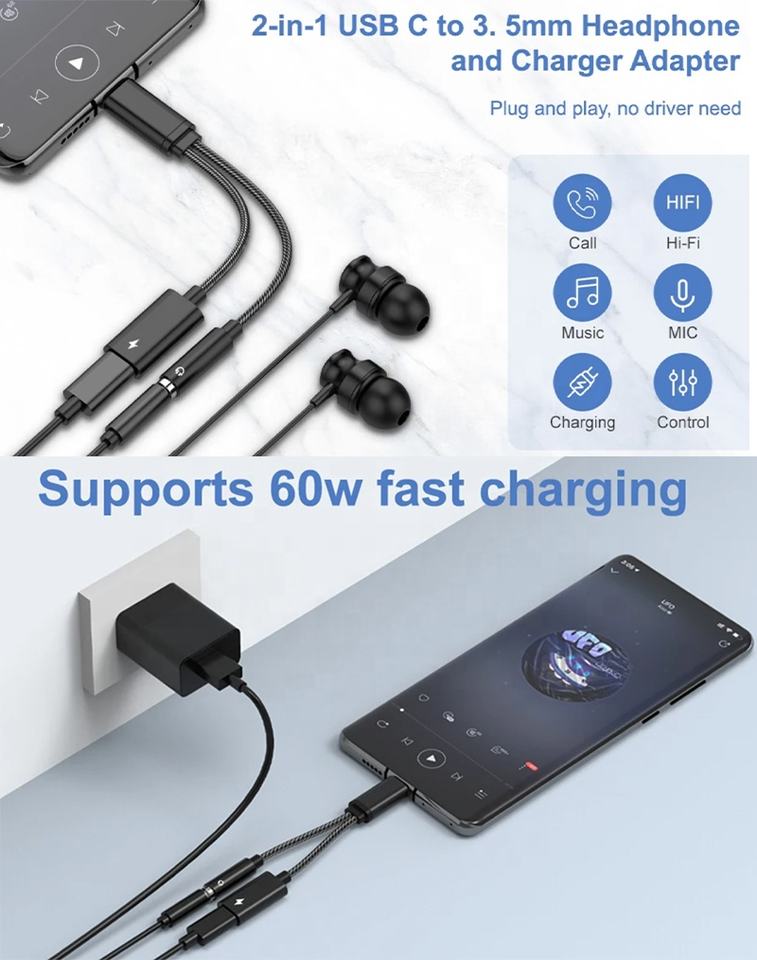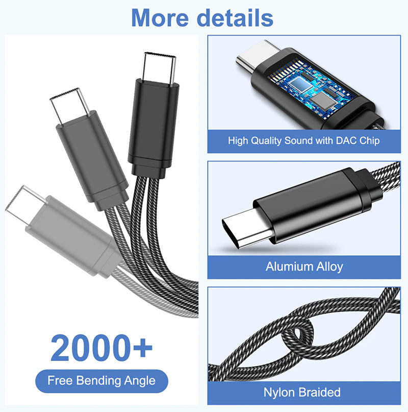 Câble convertisseur numérique 2 en 1 Type C 3,5 mm Adaptateur audio casque chargeur PVC Microphone Haut-parleur Type-C vers adaptateur 3,5 mm