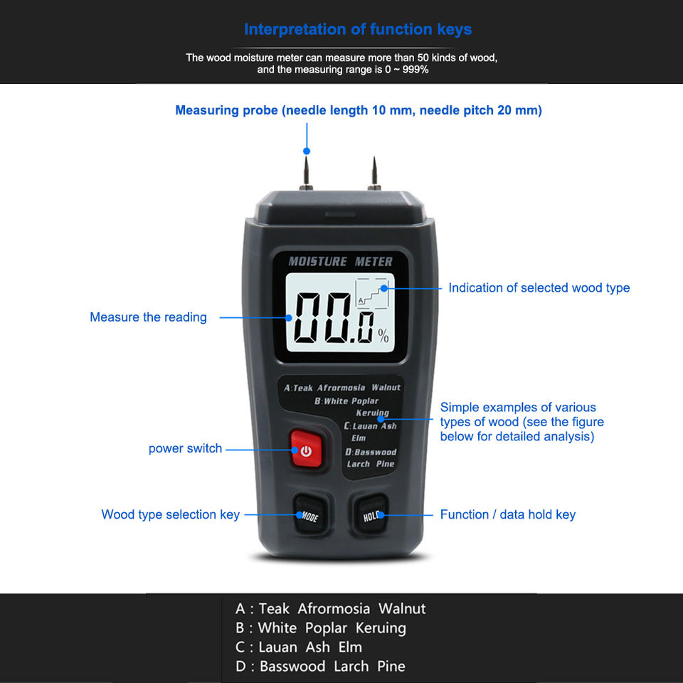 Humidimètre numérique, détecteur d'humidité, testeur d'humidité du bois et du papier, capteur à broche sans batterie