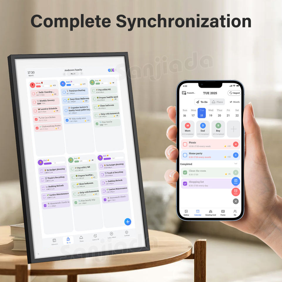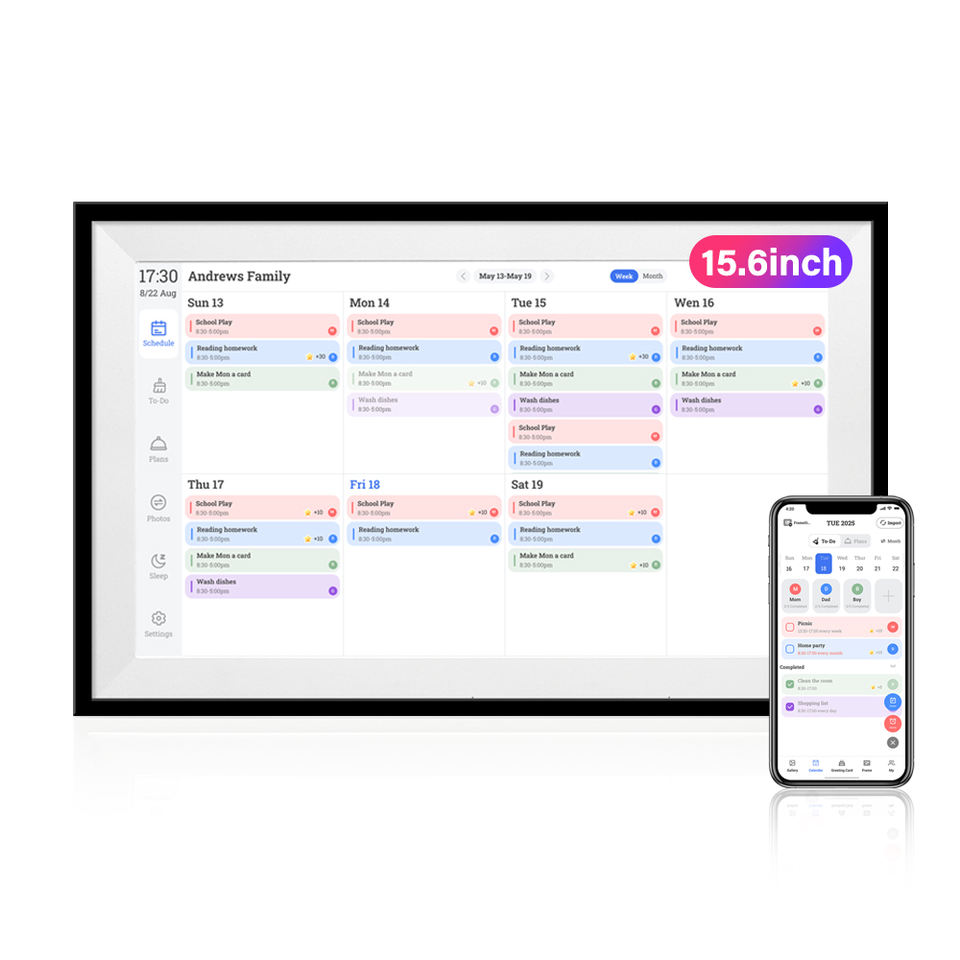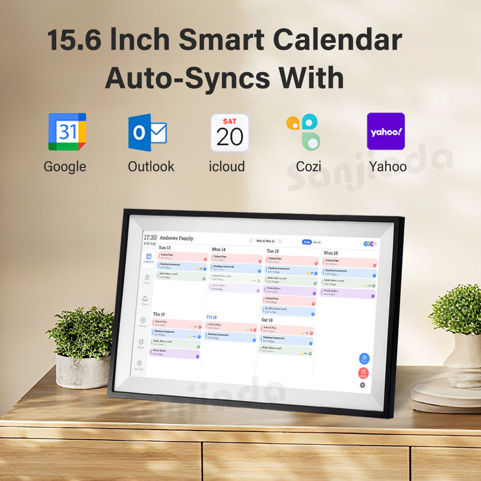 Calendrier numérique intelligent 15,6" tactile pour la famille — agenda avec tableau des tâches, synchronisation Wi‑Fi, bureau/mural