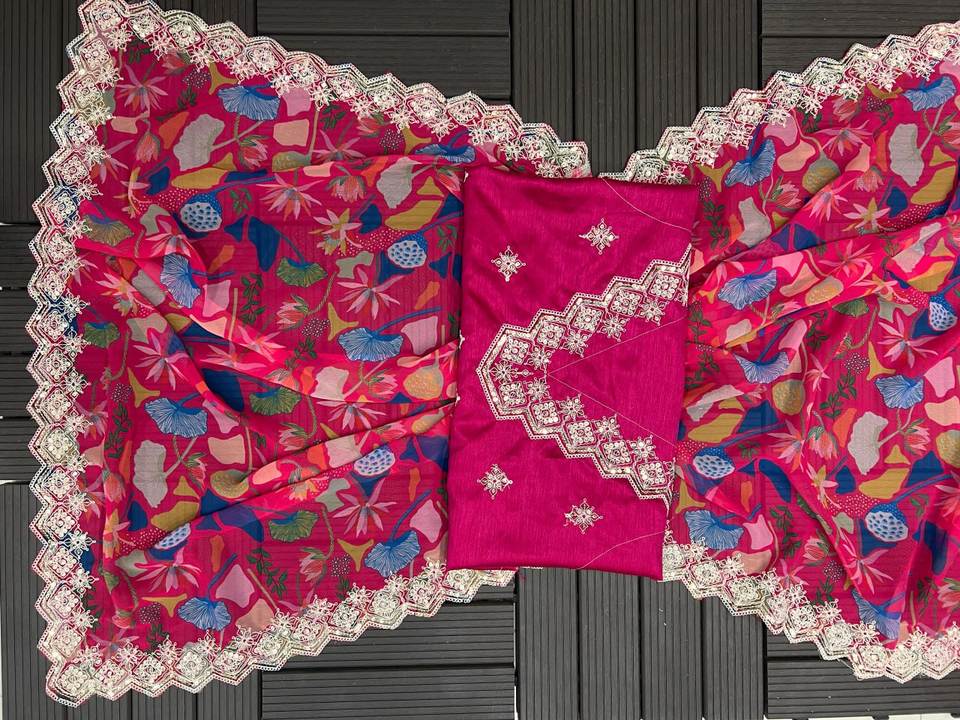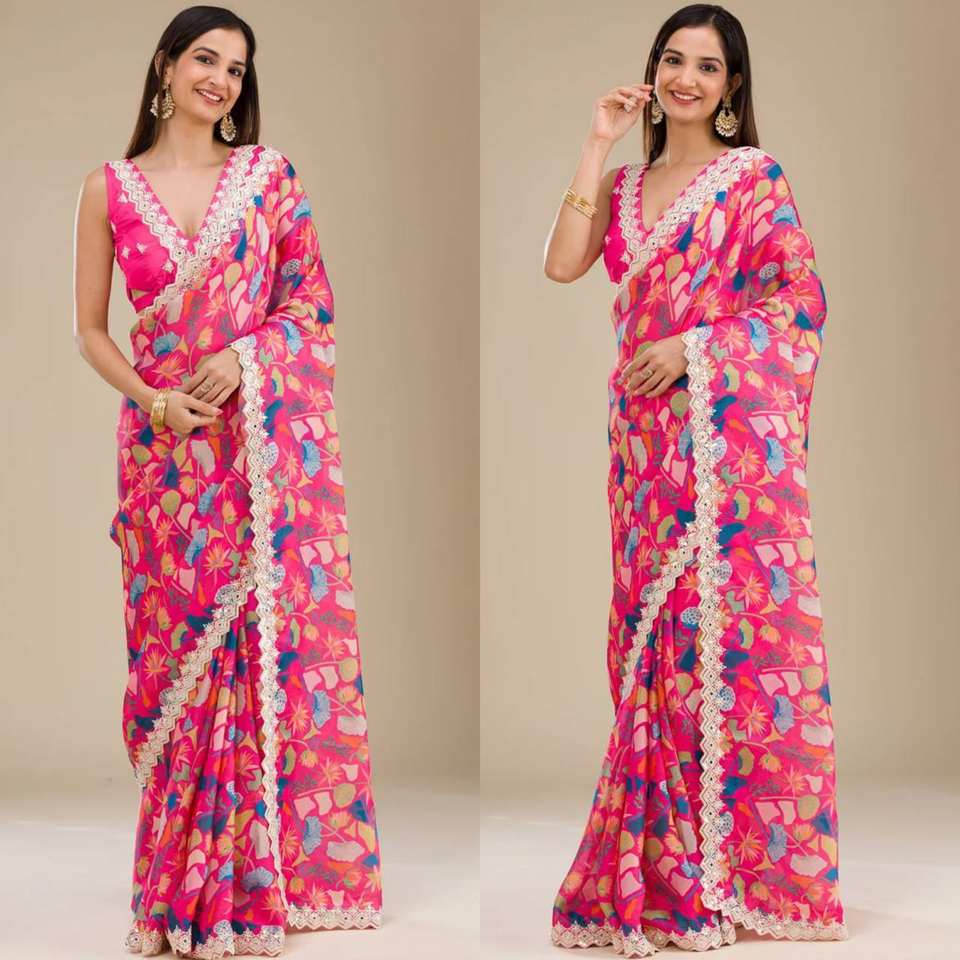 Sari en Georgette Imprimé Numérique avec Broderie Fantaisie à Points Chaîne pour Femme, Idéal pour les Fêtes, Toutes Saisons, Lavable, Prix Bas