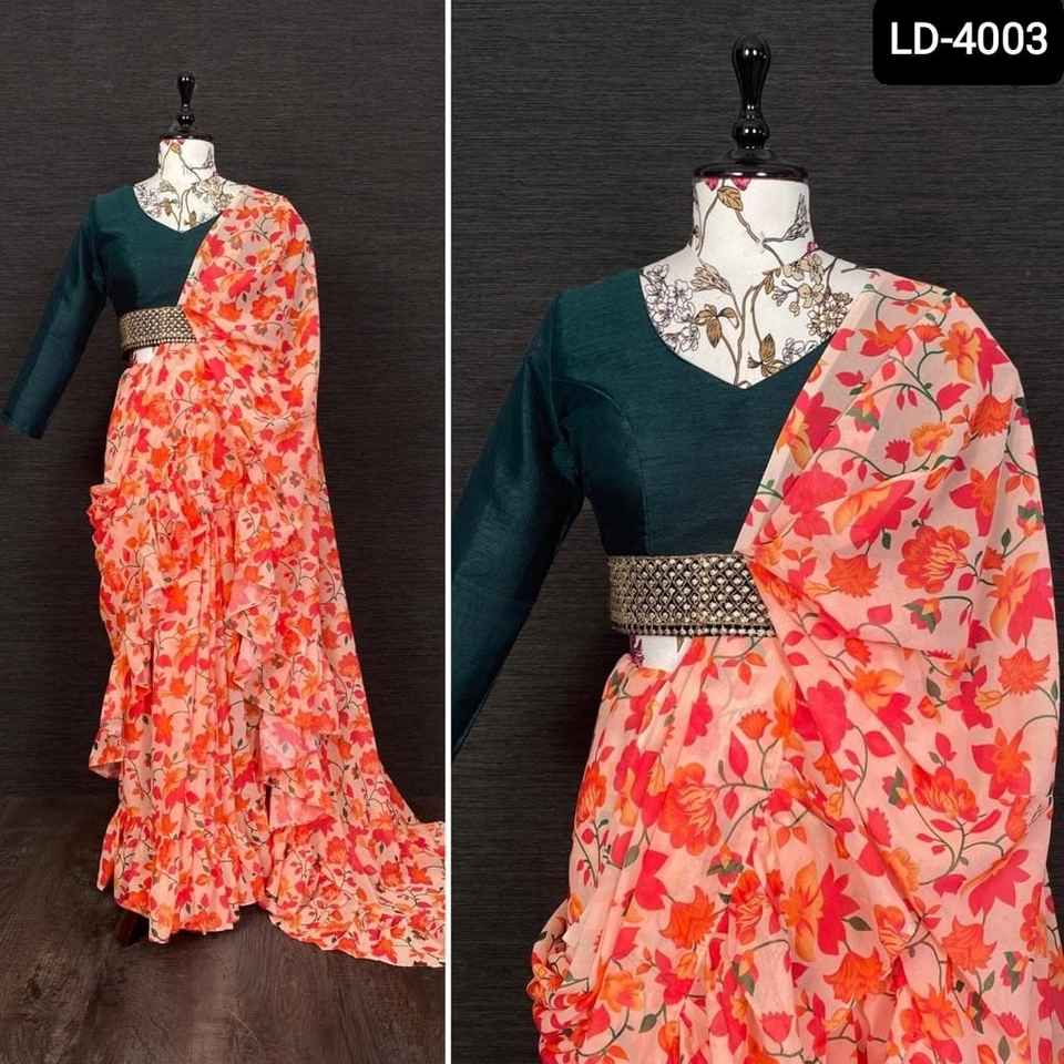 Saree à bordure en dentelle georgette imprimée numérique Nouveau design Vêtements de mariage indiens et pakistanais fantaisie avec détail à volants