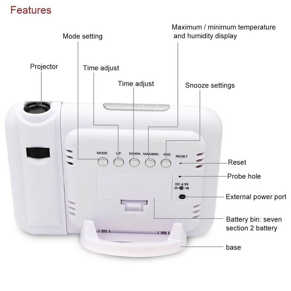 Réveil numérique avec projection, fonction snooze, prévisions météo, horloge de projection, température et humidité de la table, affichage couleur hebdomadaire