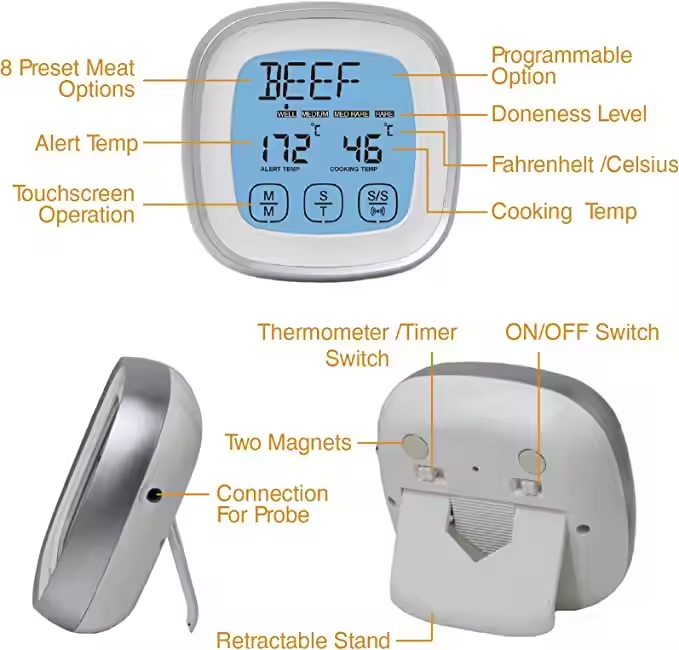 Thermomètre à viande programmable numérique filaire pour cuisson, cuisson, grillades et friteuse à air