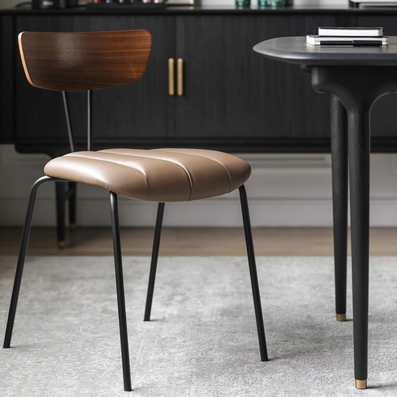 Chaise de salle à manger avec dossier, assise en cuir marron, dossier en bois, pieds en métal, style nordique, pour salon, usage domestique