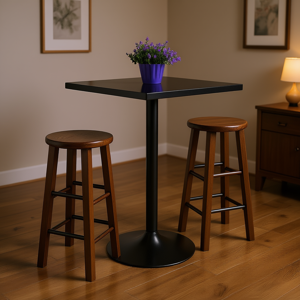 Ensemble salle à manger : table carrée noire avec pieds en métal, 2 tabourets en bois, design moderne pour salle à manger