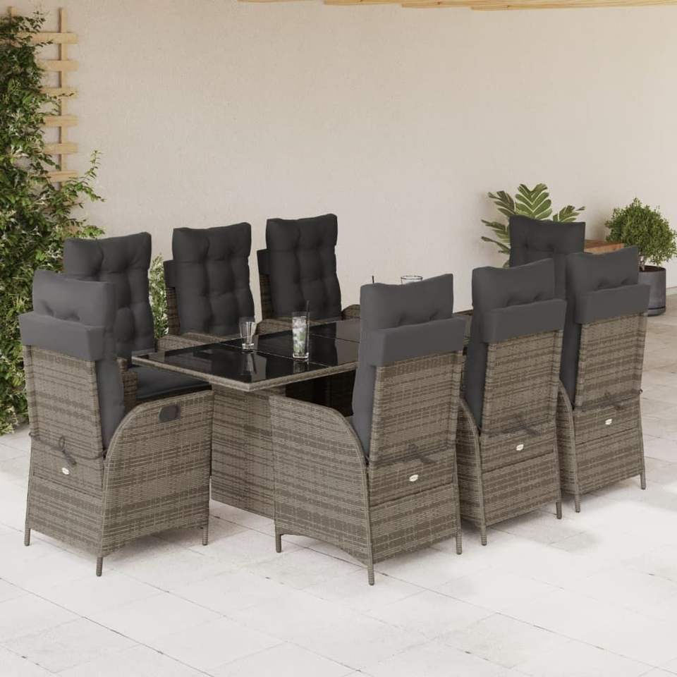 Ensemble de salle à manger pour jardin en rotin gris avec structure en acier thermolaqué, table en verre trempé, mobilier d'extérieur contemporain 8 places