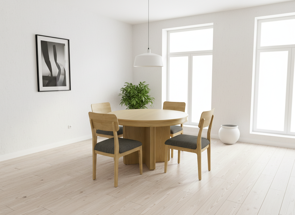 Ensemble table ronde et table basse en frêne massif, style minimaliste moderne, avec 4 chaises, finition naturelle, meubles de salon