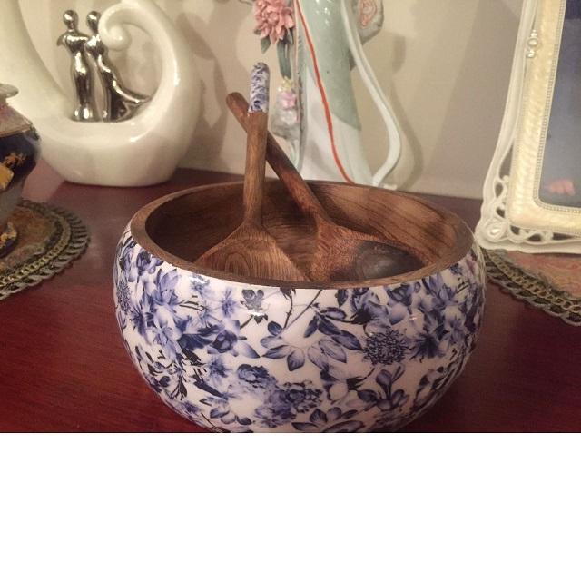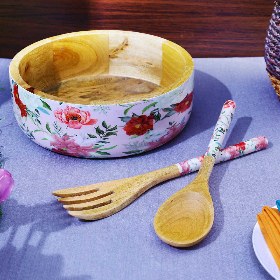 Exclusive Handmade Natural Wood Enamel Printed Salad Bowl Large Round Serving Bowl for Home Dining and Hospitality