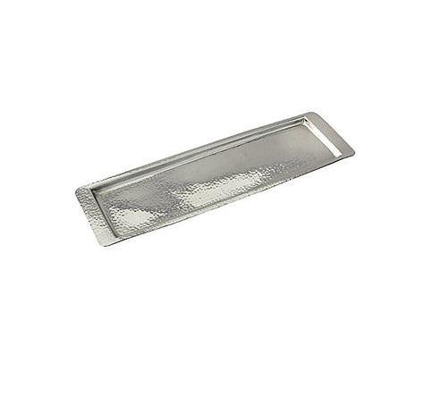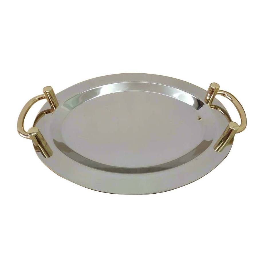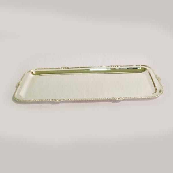 Plateau de service rectangulaire en métal avec poignées, design exclusif, pour aliments et desserts, usage en cuisine.