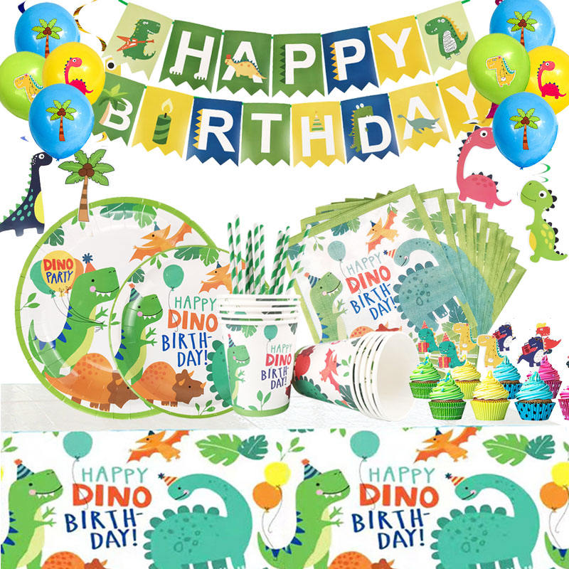 Vaisselle jetable de fête d'anniversaire de dinosaure, ensemble de ballons pour enfants, décoration de fête d'anniversaire de garçon, fournitures de fête de Jungle avec bannière