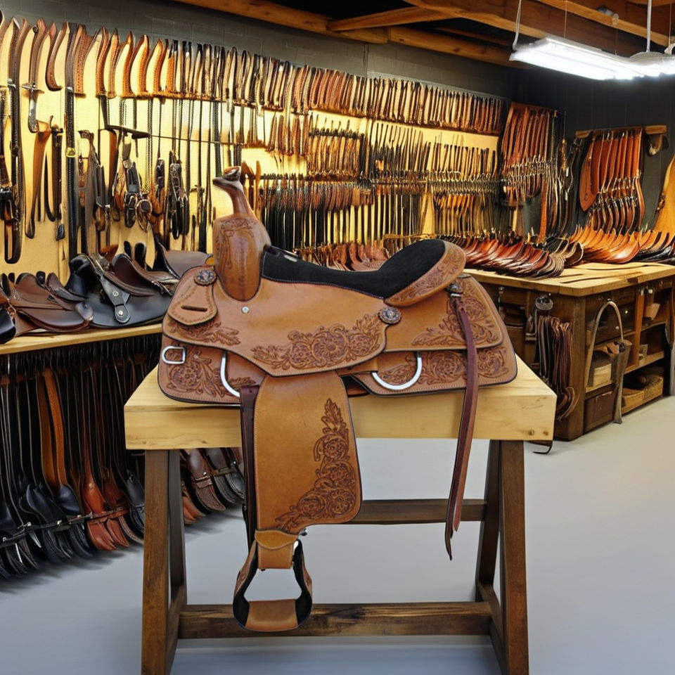Selle Western Ranch Trail en cuir de vachette avec décoration usinée florale synthétique utilisable pour l'équitation