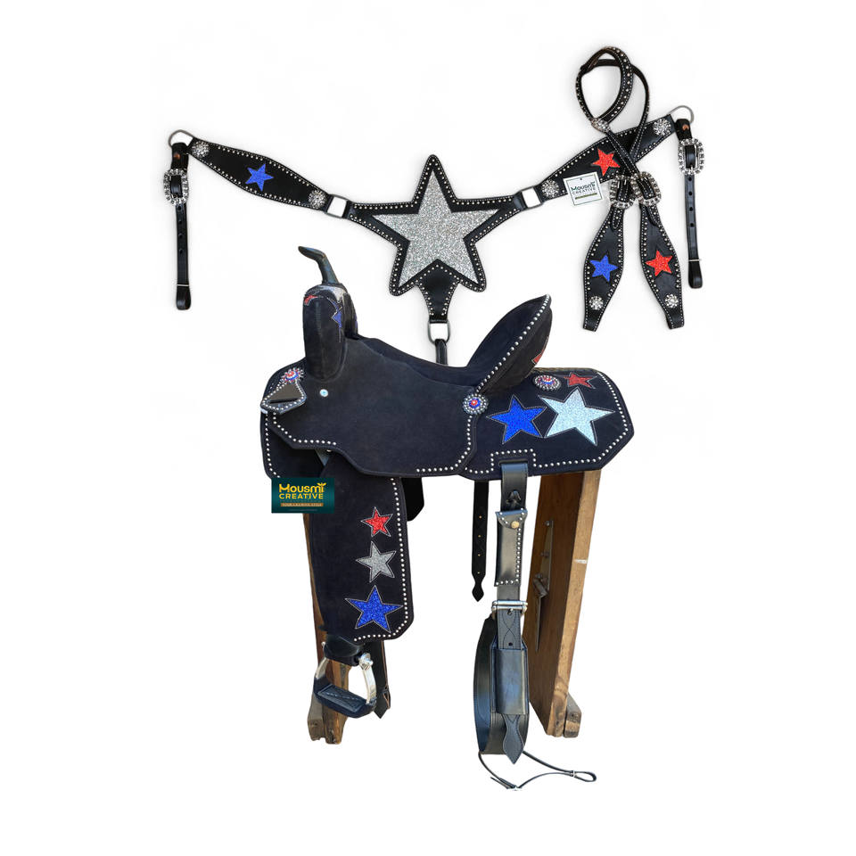 Direct Factory Export Western Horse Argentina Cowhide Leather Glitter Star Patched Saddle & Matching Headstall Tack Set Supplier