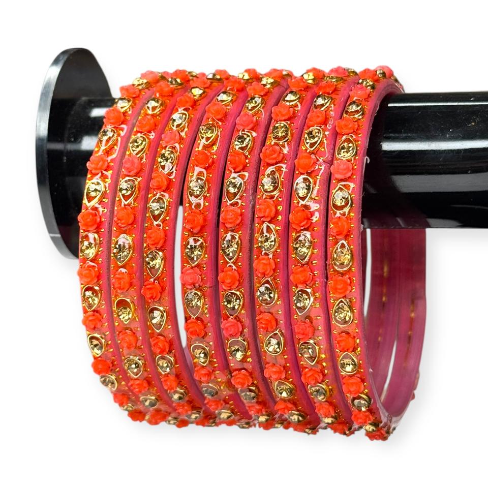 Direct Factory Gold Plated Trendy Pink Floral Glass Bangles Set Sparkling Crystal Work Glossy Finish Wholesale Price for Women