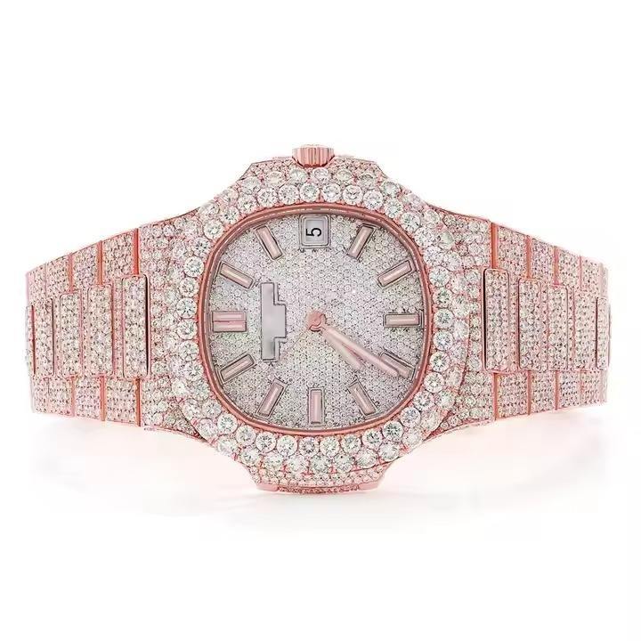 Montre automatique en or rose luxueuse avec diamants en moissanite VVS, mouvement à quartz, disponible pour l'exportation, prix direct usine