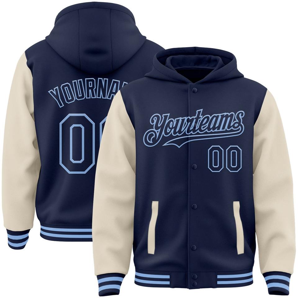 Vente en gros de bombardiers décontractés d'hiver personnalisés bleu marine blanc-bleu clair veste à capuche bicolore Varsity Letterman à snap complet
