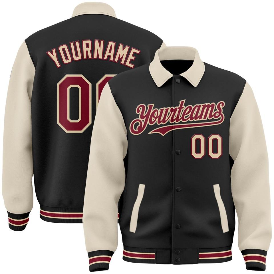 Vente en gros directe de l'industrie, veste bomber décontractée d'hiver personnalisée, noir et blanc, entièrement à boutons-pression, varsity, lettreman, deux tons, col à revers, veste Byron