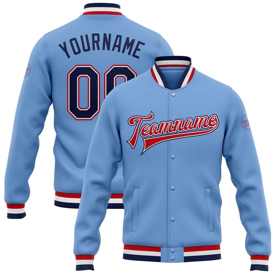 Direct Industry Wholesale Casual Winter Custom Light Blue Red-White Bomber Full-Snap Varsity Letterman Jacket