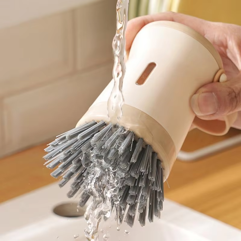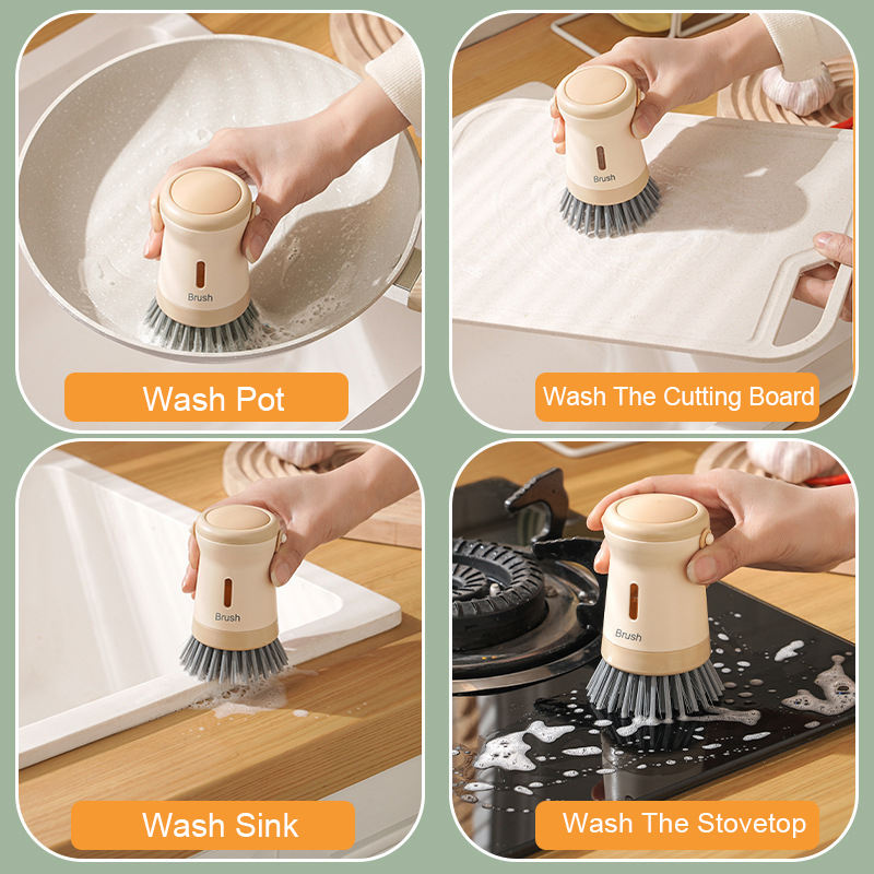 Brosse à vaisselle avec distributeur de savon, éponge de cuisine à pression pour casseroles, conception de rangement suspendu, outil de lavage pour cuisinières et plaques de cuisson