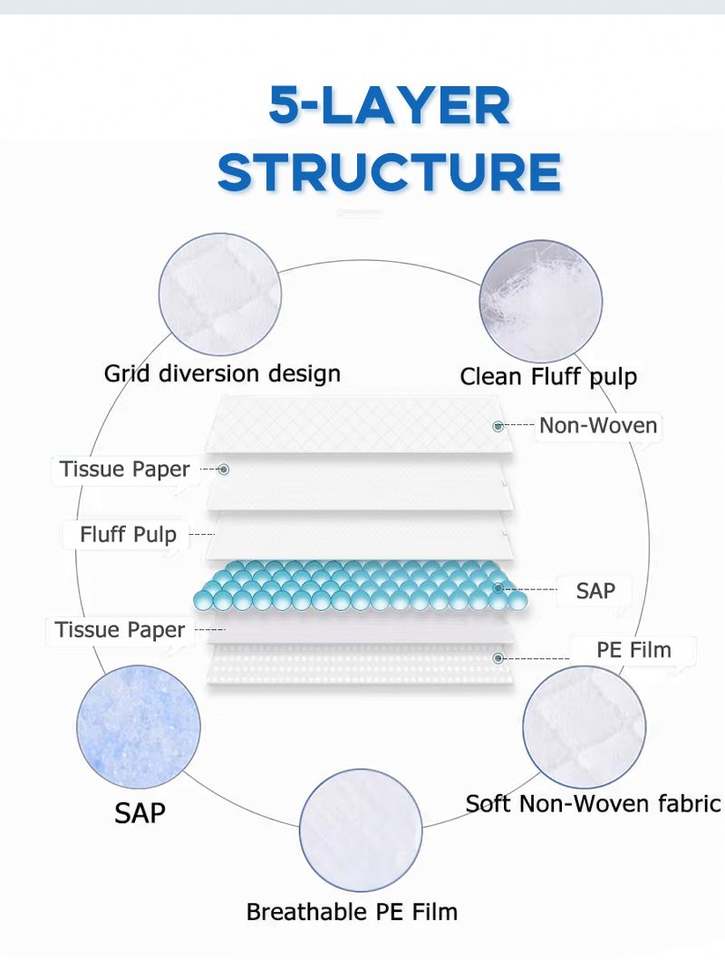 5 plys, Underpad jetable d'urine absorbante de 5 plis