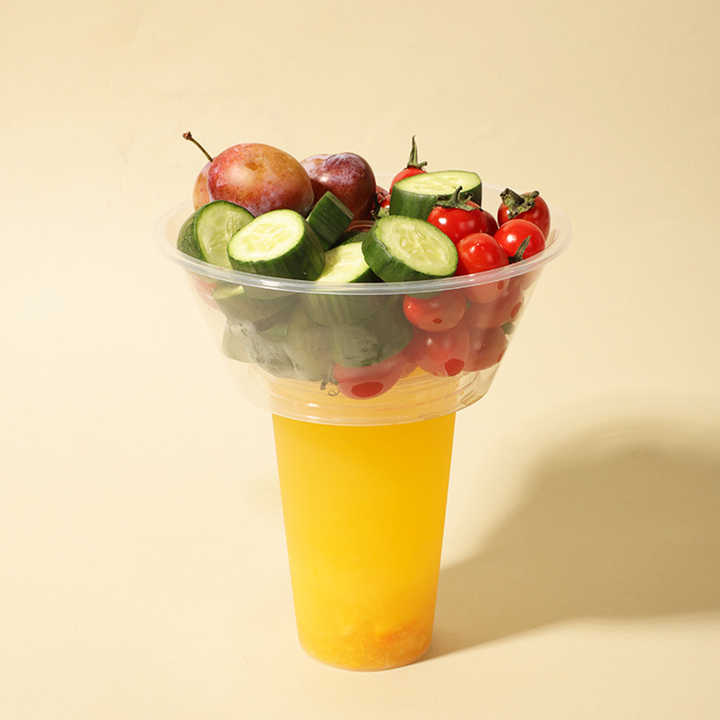 Gobelets jetables 2-en-1 pour snacks et boissons avec paille, 700 ml (bols à snacks à paroi simple) et 500 ml (gobelets en plastique), personnalisables avec logo, vente en gros