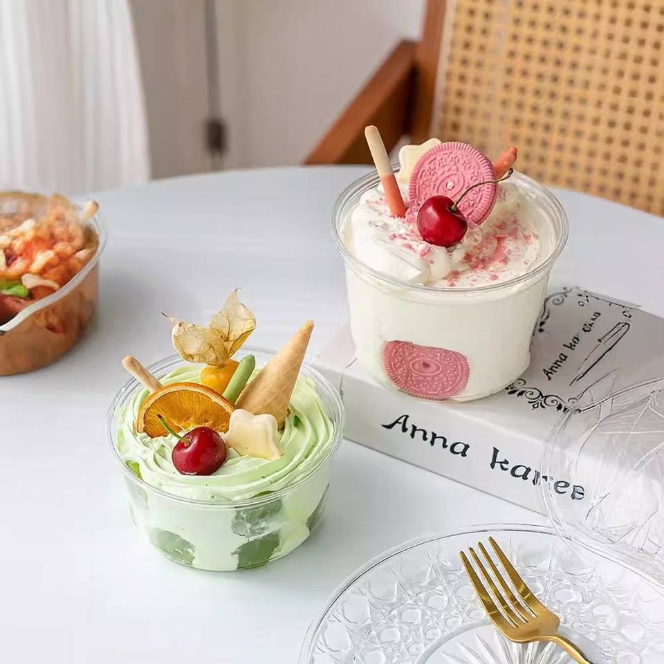 Gobelets jetables en plastique transparent impression Logo 12 OZ PET tasse de crème glacée pour gâteau Dessert salade yaourt avec couvercle