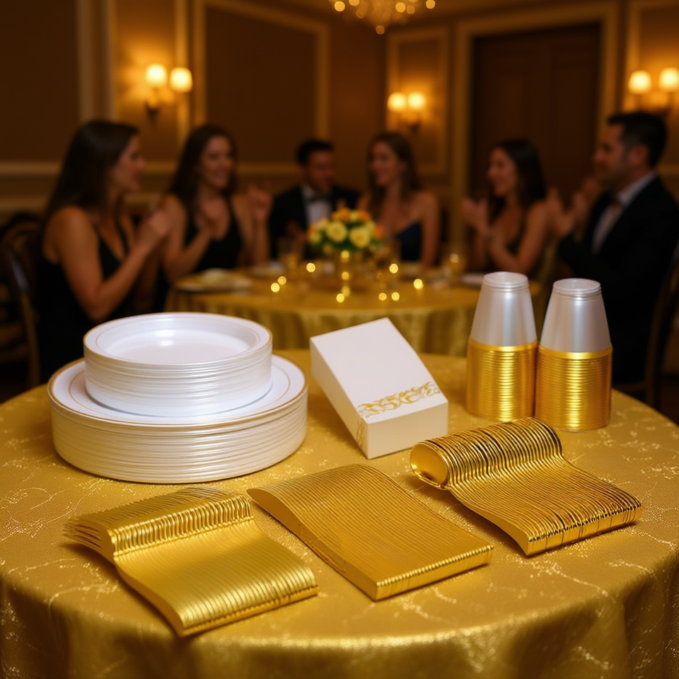 Service de vaisselle jetable doré 175 pièces, assiettes, gobelets, couverts et serviettes en plastique pour fête, style classique