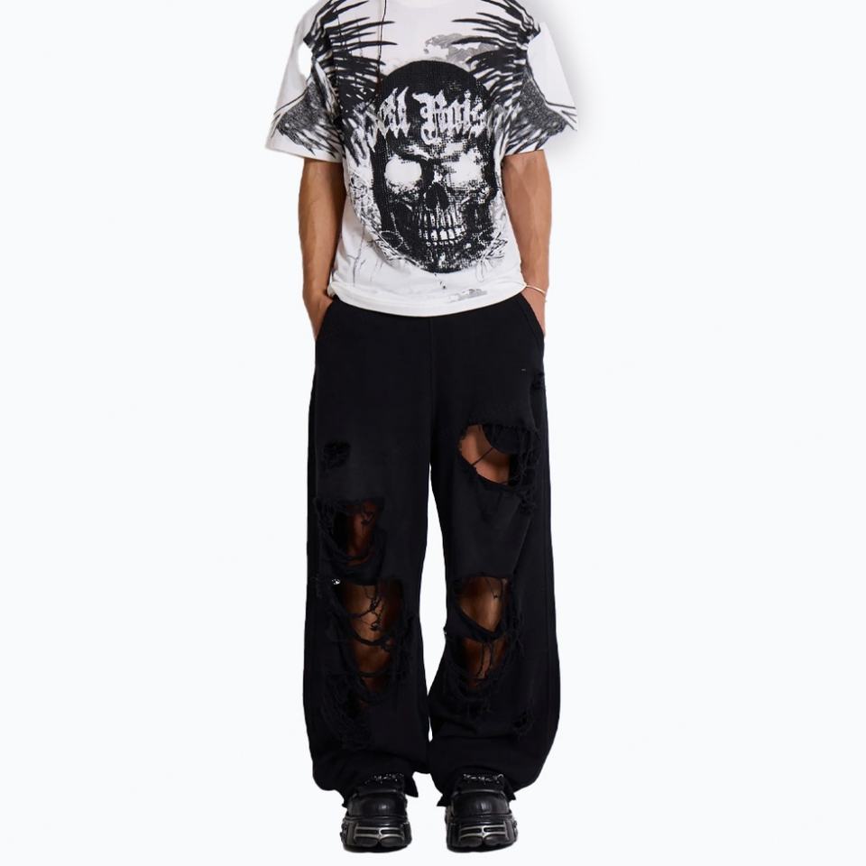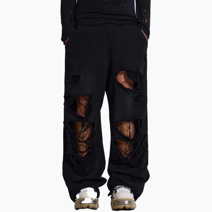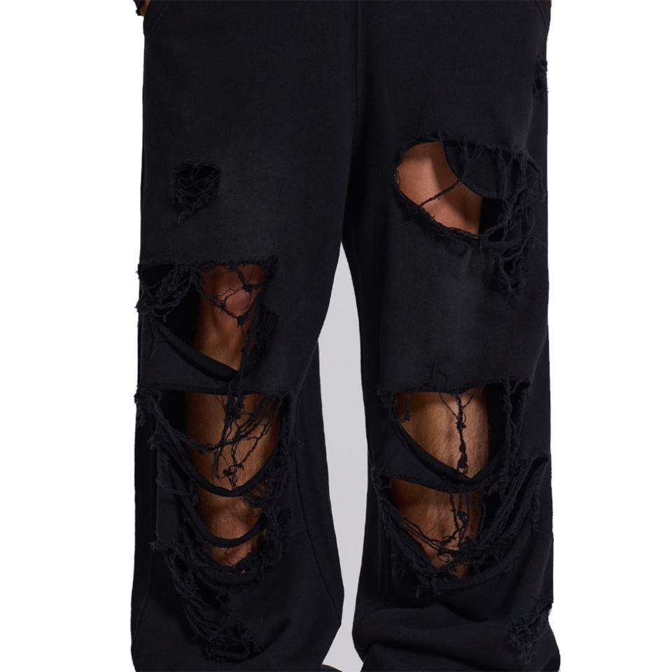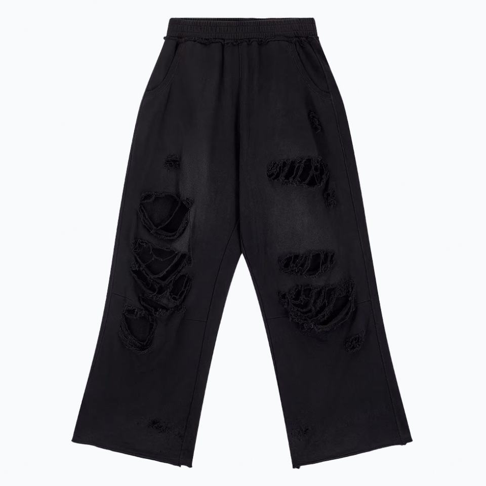 Pantalon de jogging ample et droit en molleton épais de coton French Terry, effet vieilli, déchiré, bords bruts, délavé