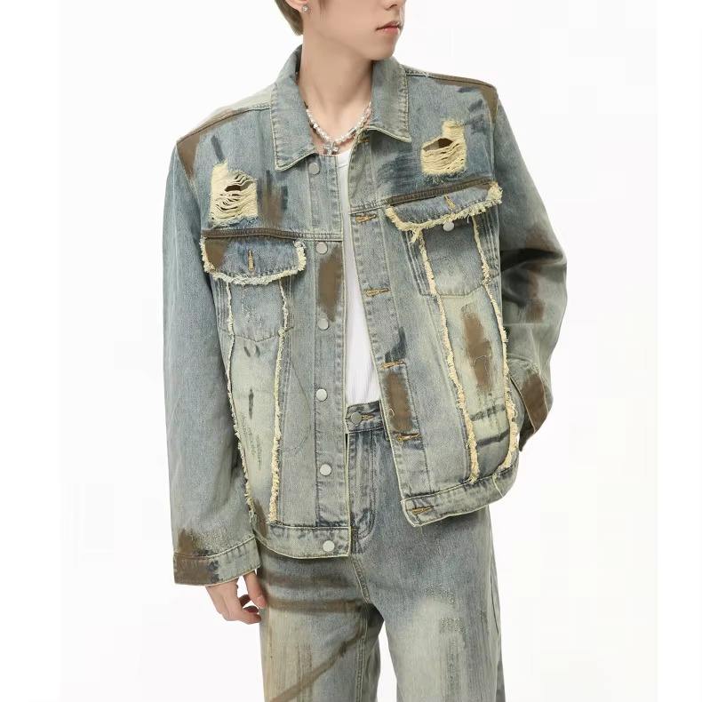 Veste en jean pour hommes, manteau en jean déchiré surdimensionné, vêtements d'extérieur vintage délavés, fournisseur de gros