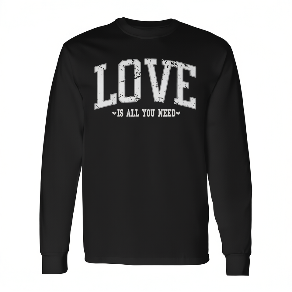 T-shirt à manches longues style universitaire vieilli « Love Is All You Need » – Design personnalisable promotionnel
