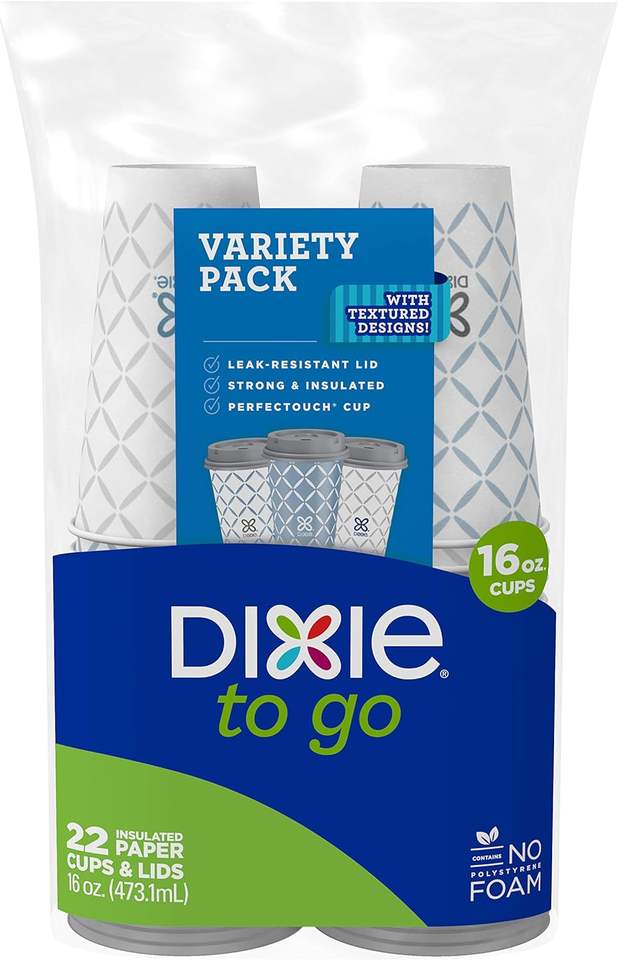 Tasses et couvercles à boissons chaudes Dixie To Go, 16 onces, 132 pièces, modèles assortis, tasses et couvercles à café en papier jetables