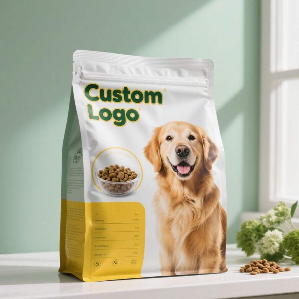 Sachet d'emballage pour aliments pour chiens à fond carré, imprimé sur mesure, avec logo personnalisé, fermeture éclair refermable, en PET de qualité alimentaire
