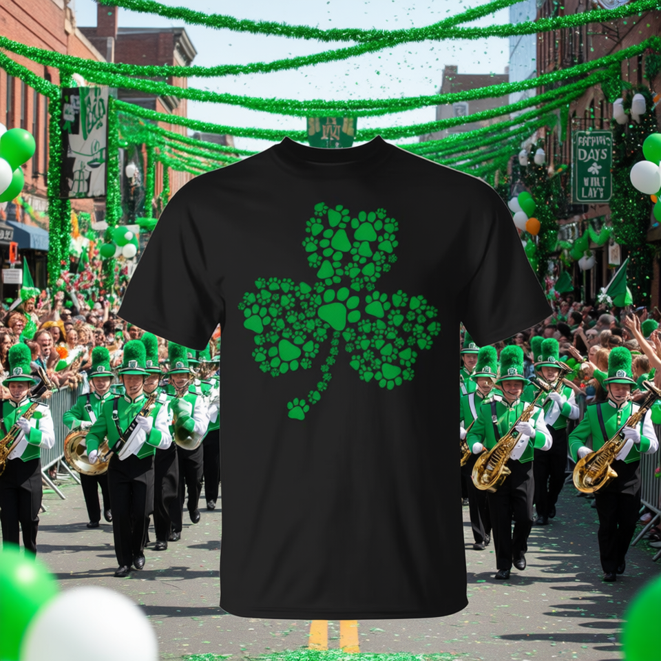 T-shirt noir unisexe pour adulte avec empreinte de patte de chien Shamrock St Patricks Day