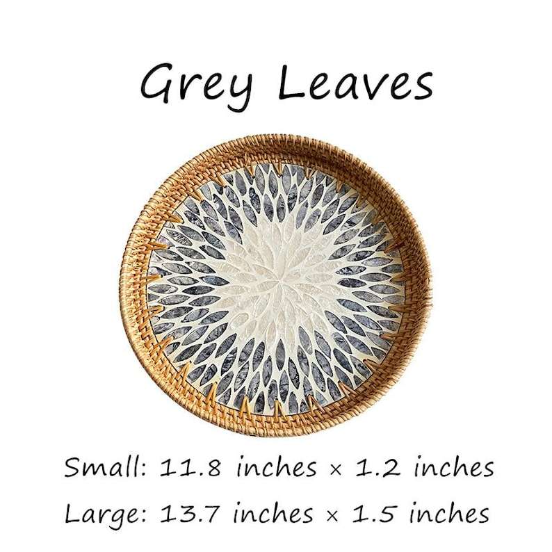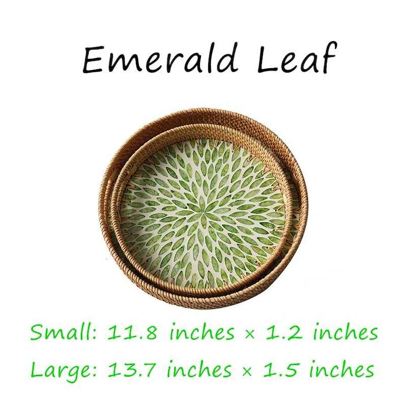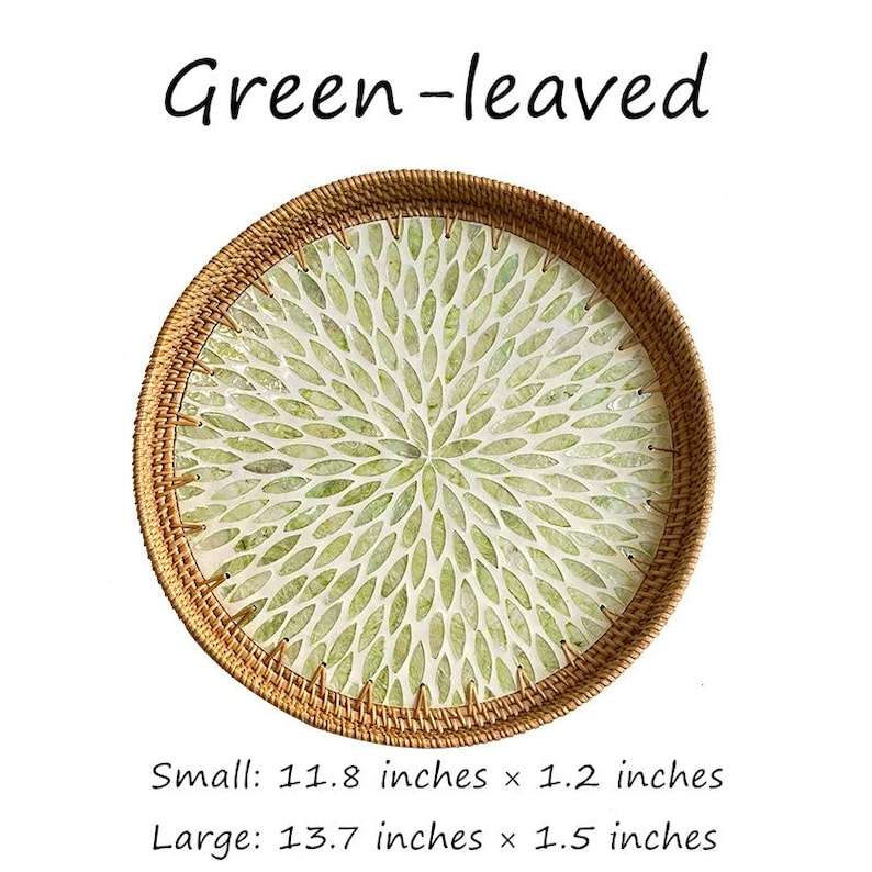 Plateau de service décoratif en rotin et nacre à motif de feuilles d'émeraude, idéal pour la décoration intérieure et la présentation de collations, par UO